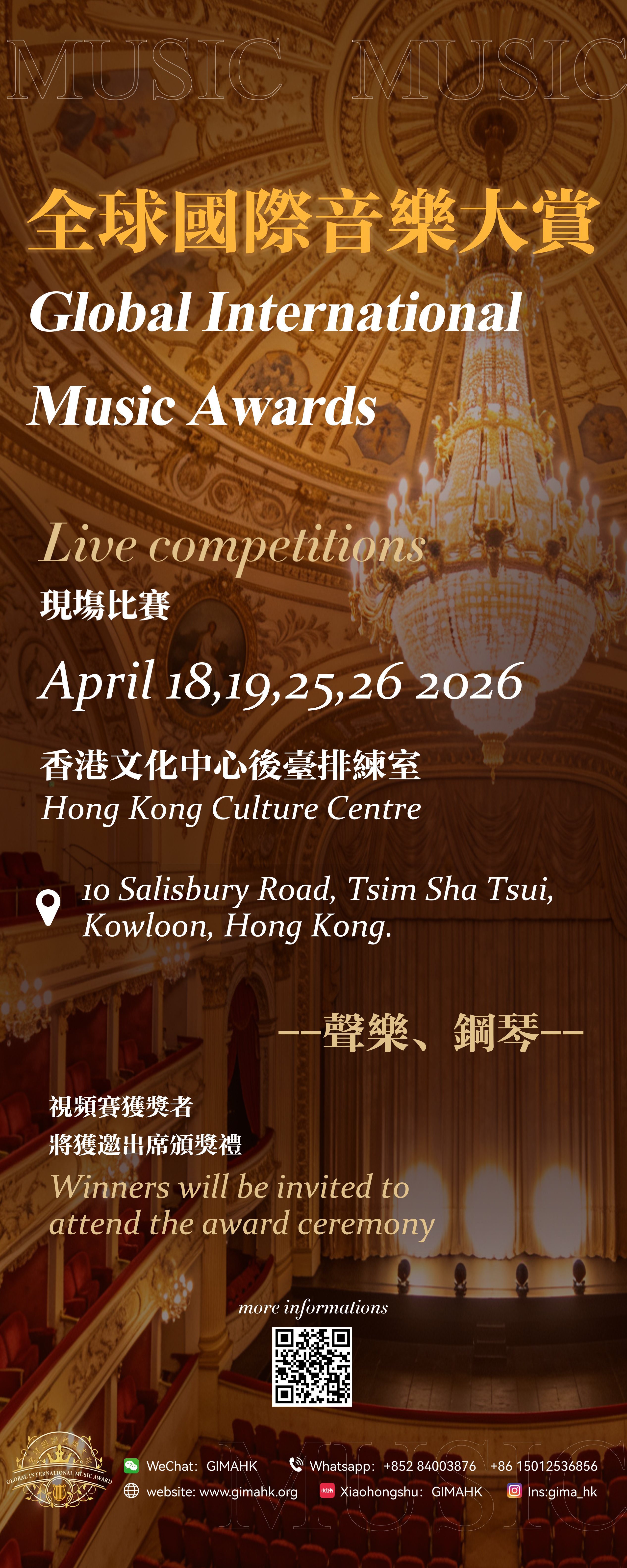全球國際音樂大賞采用一輪製比賽。本次比賽設有實體比賽和網上影片比賽。每組別獲獎名次設置:冠軍、亞軍、季軍、殿軍金獎、銀獎、銅獎獲獎選手獲頒發獎杯及賽事評委簽名證書比賽評分標準:冠軍、亞軍、季軍、殿軍:每組別85分以上的前四名金獎:85-99分銀獎:75-84分銅獎:65-74分*評審團有權決定最終的比賽結果,若選手達不到比賽規定的水準或基準,評審團有權決定名次空缺。